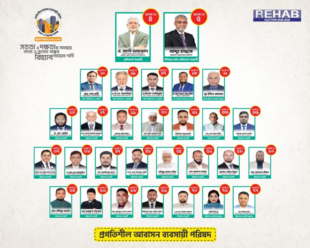 আবাসন খাতের শীর্ষ সংগঠন রিয়েল এস্টেট এ্যান্ড হাউজিং এসোসিয়েশনস অব বাংলাদেশ (রিহ্যাব)-এর আসন্ন নির্বাচনে অংশগ্রহণের লক্ষ্যে দেশ বরেণ্য কৃষি বিজ্ঞানী ড. আলী আফজালকে (প্রেসিডেন্ট) ও আরমা গ্রুপের চেয়ারম্যান আব্দুর রাজ্জাককে সিনিয়র ভাইস প্রেসিডেন্ট করে ২৯ সদস্যের পূর্ণ প্যানেল ঘোষণা করেছে প্রগতিশীল আবাসন ব্যবসায়ী পরিষদ।